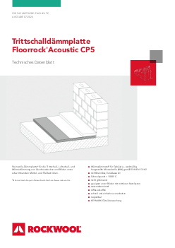 Floorrock Acoustic CP5 ist eine nichtbrennbare Steinwolle-Dämmplatte. Sie eignet sich für die oberseitige Trittschall-, Luftschall- und Wärmedämmung von Geschossdecken und Böden unter schwimmenden Mörtel- und Fließestrichen auf Dämmschicht mit Schallschutzanforderungen. Sie bietet sehr guten Schallschutz bei eingeschränkter Flächenbelastbarkeit. Sie eignet sich auch für Heizestriche, Estriche mit keramischen Belägen und maschinell zu glättende Estriche. Sie eignet sich nicht für die Verwendung unter Gussasphaltestrichen oder Trockenestrichen.