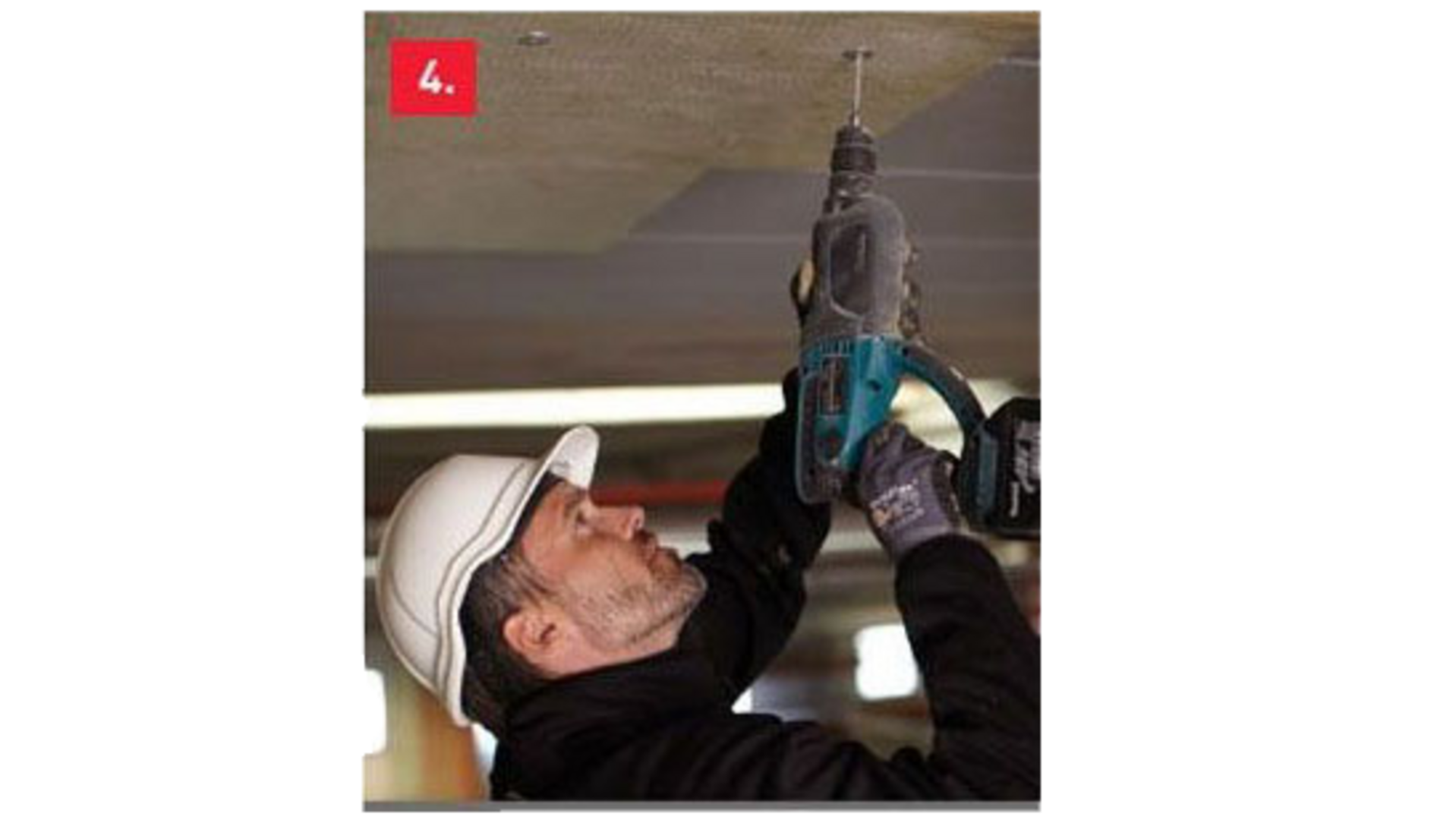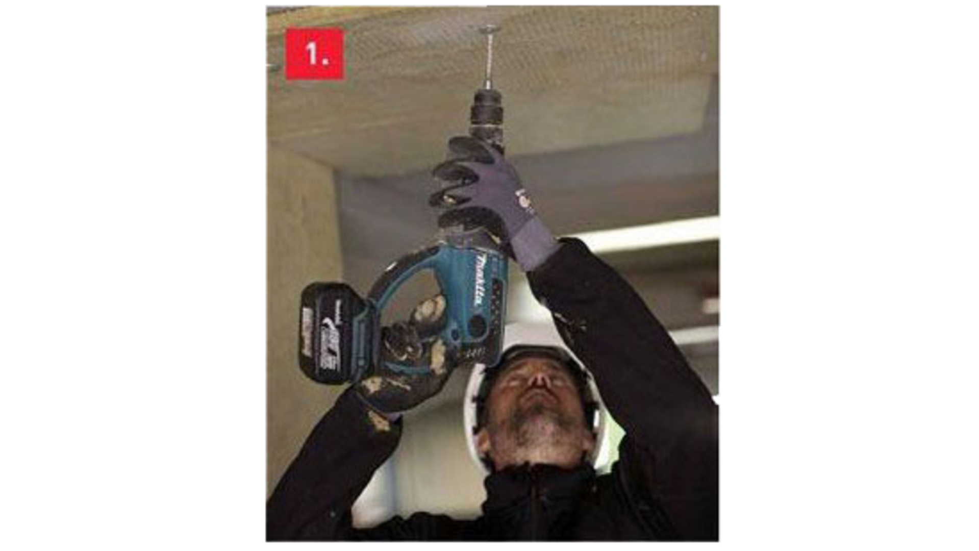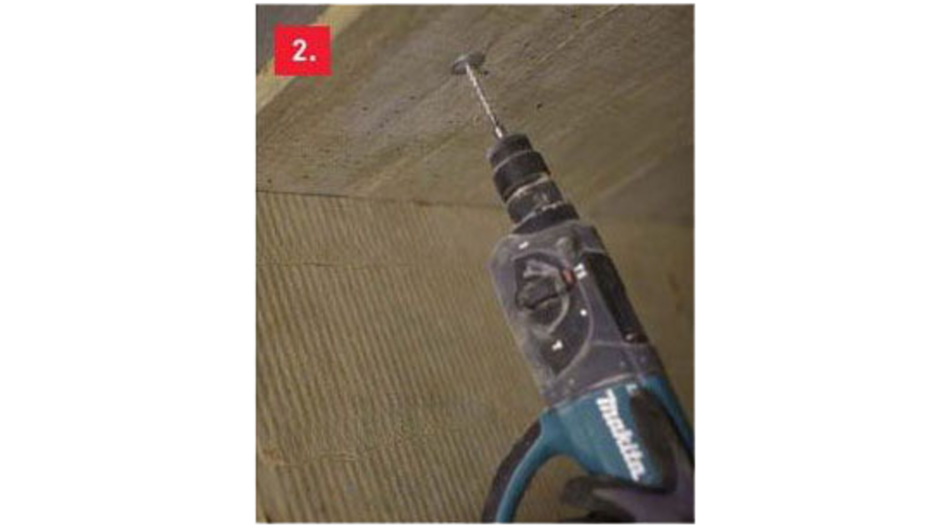 1. Pidä eristelevyä ontelolaattaa vasten ja esiporaa betoniin 35 mm syvä reikä 5x50/30 mm:n pikanaulalle. Betoniruuvia käytettäessä noudata ruuvivalmistajan ohjeistamaa poraussyvyyttä.