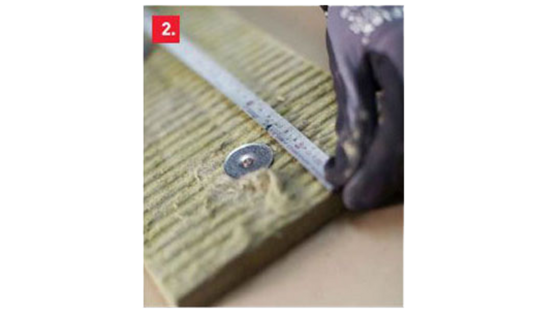 • 60 mm:n eristepaksuuteen asti max. kiinnikeväli on 275 mm. Yli 60 mm:n eristepaksuuksille käytetään max. kiinnikeväliä 225 mm. Reunakiinnitysetäisyys eristelevyn lyhyillä sivuilla tulee olla 50 mm ja pitkillä sivuilla 30 mm.
