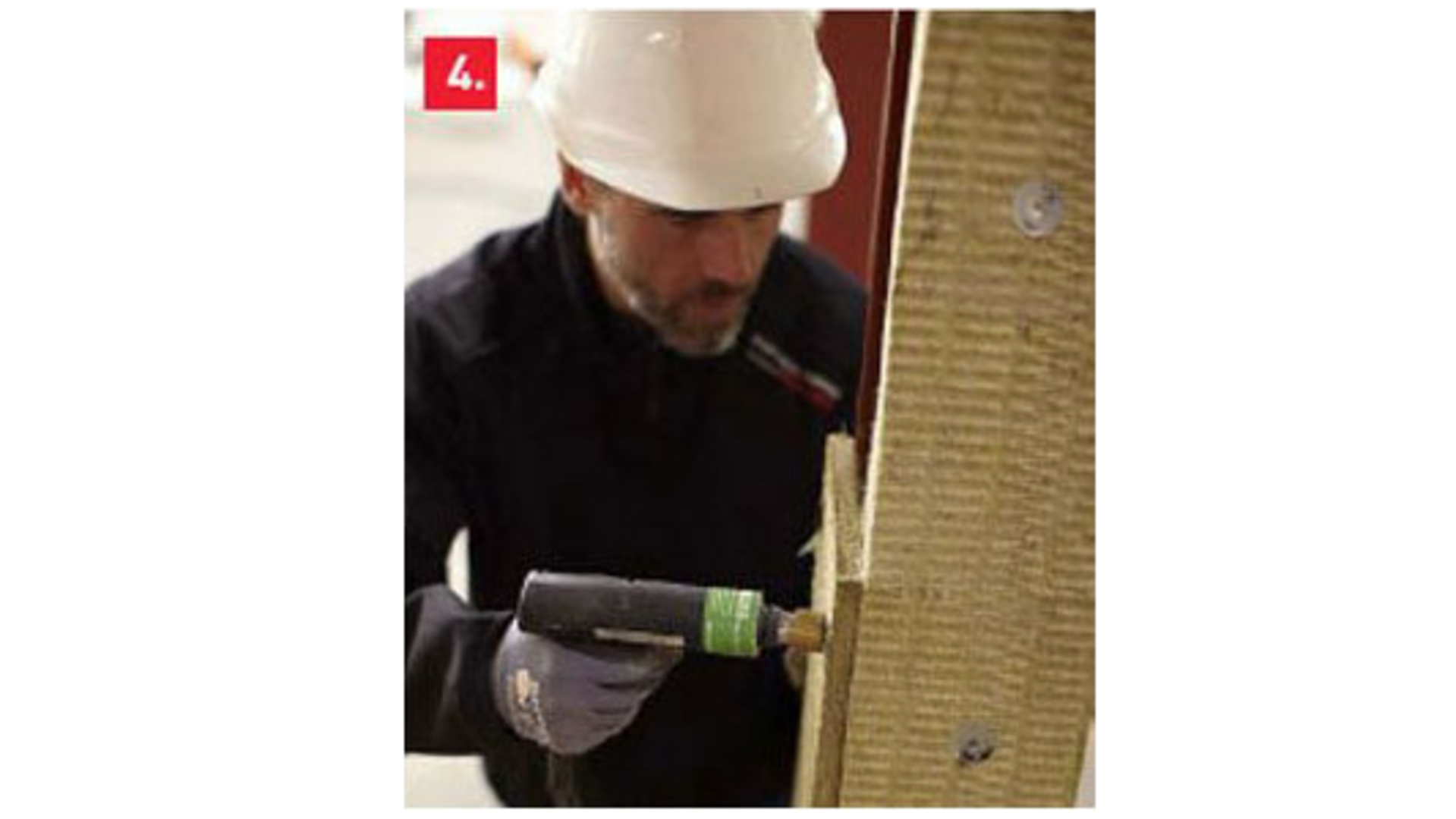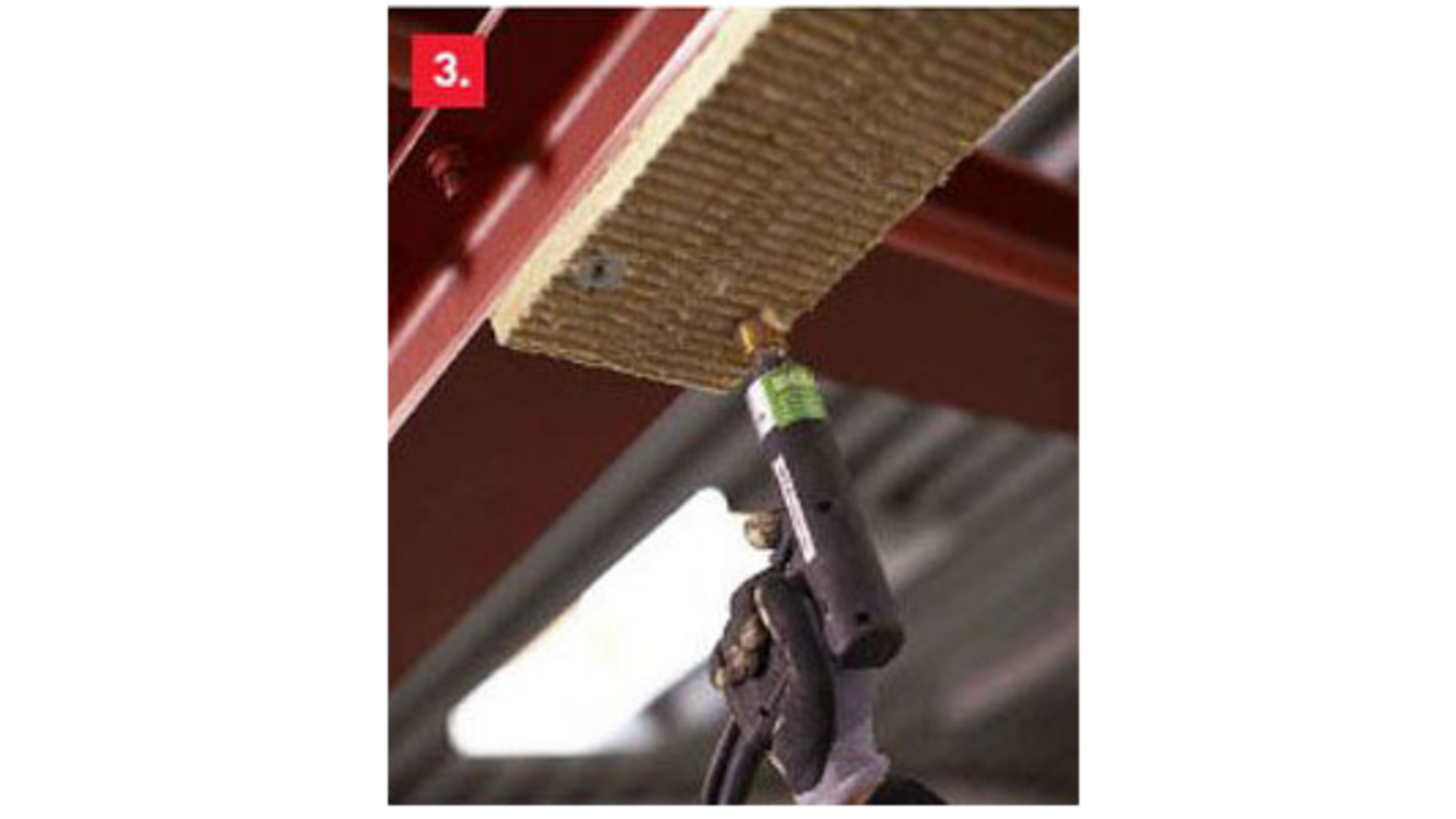 3. Hitsaa eristelevyt teräkseen kiinni hitsipiikeillä. Varmista, että hitsipiikit kiinnittyvät kunnolla.