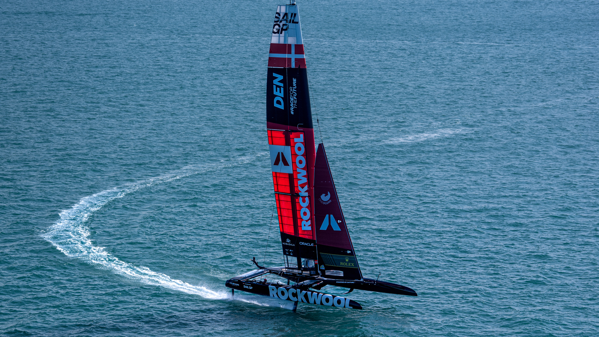 ROCKWOOL Denmark SailGP Team zig-zagging in Cadiz which allows them to follow the right angle to the breeze and sail faster than the wind speed.