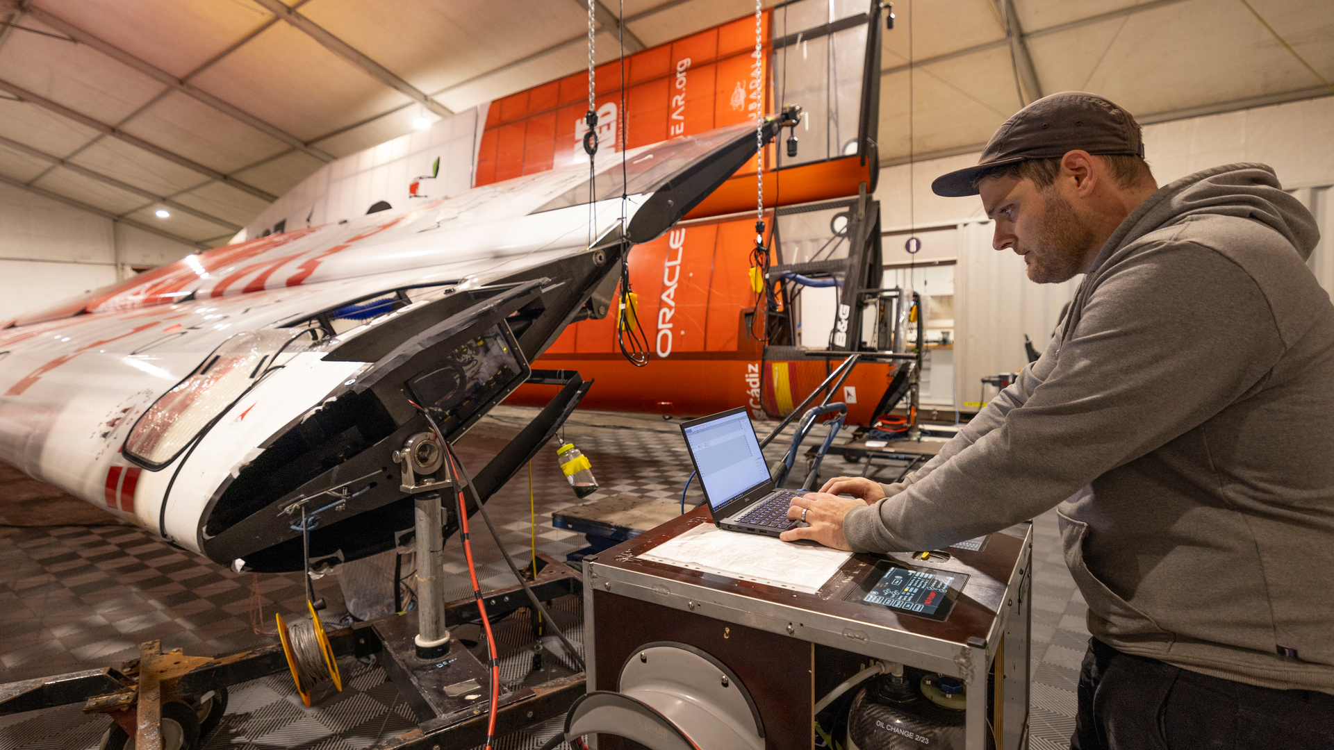 Members of the SailGP Team technical team working with the electronics of the main wing of an F50 catamaran
