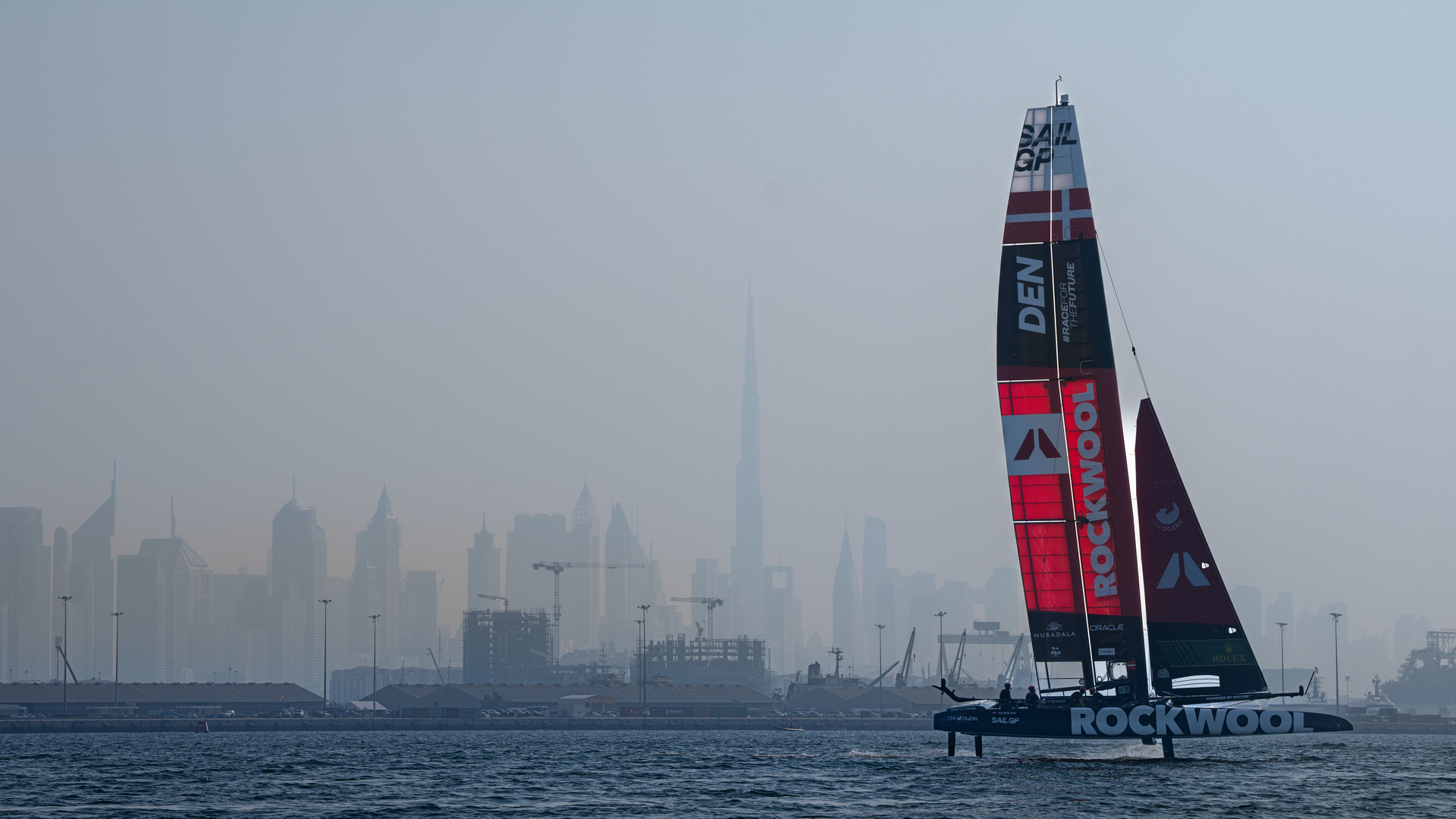 ROCKWOOL Denmark SailGP Team foiling (flying) over the shallow water of the coast of Dubai.